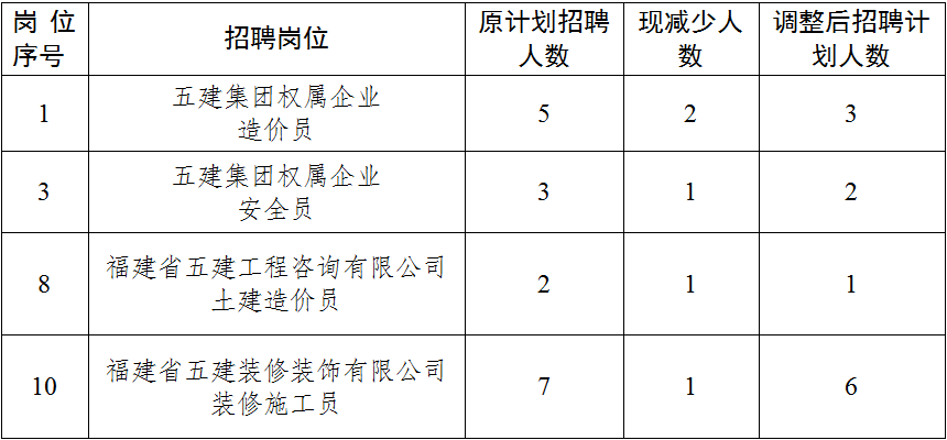 2025/07/31根據(jù)福建五建集團(tuán)2025年7月6日發(fā)布的第二批公開招聘項(xiàng)目制人員報(bào)名情況,按照《公開招聘公告》有關(guān)規(guī)定,經(jīng)研究,決定對本次招聘計(jì)劃人數(shù)與報(bào)名符合條件人數(shù)比例未達(dá)到1:3的崗位招聘計(jì)劃進(jìn)行調(diào)整。
